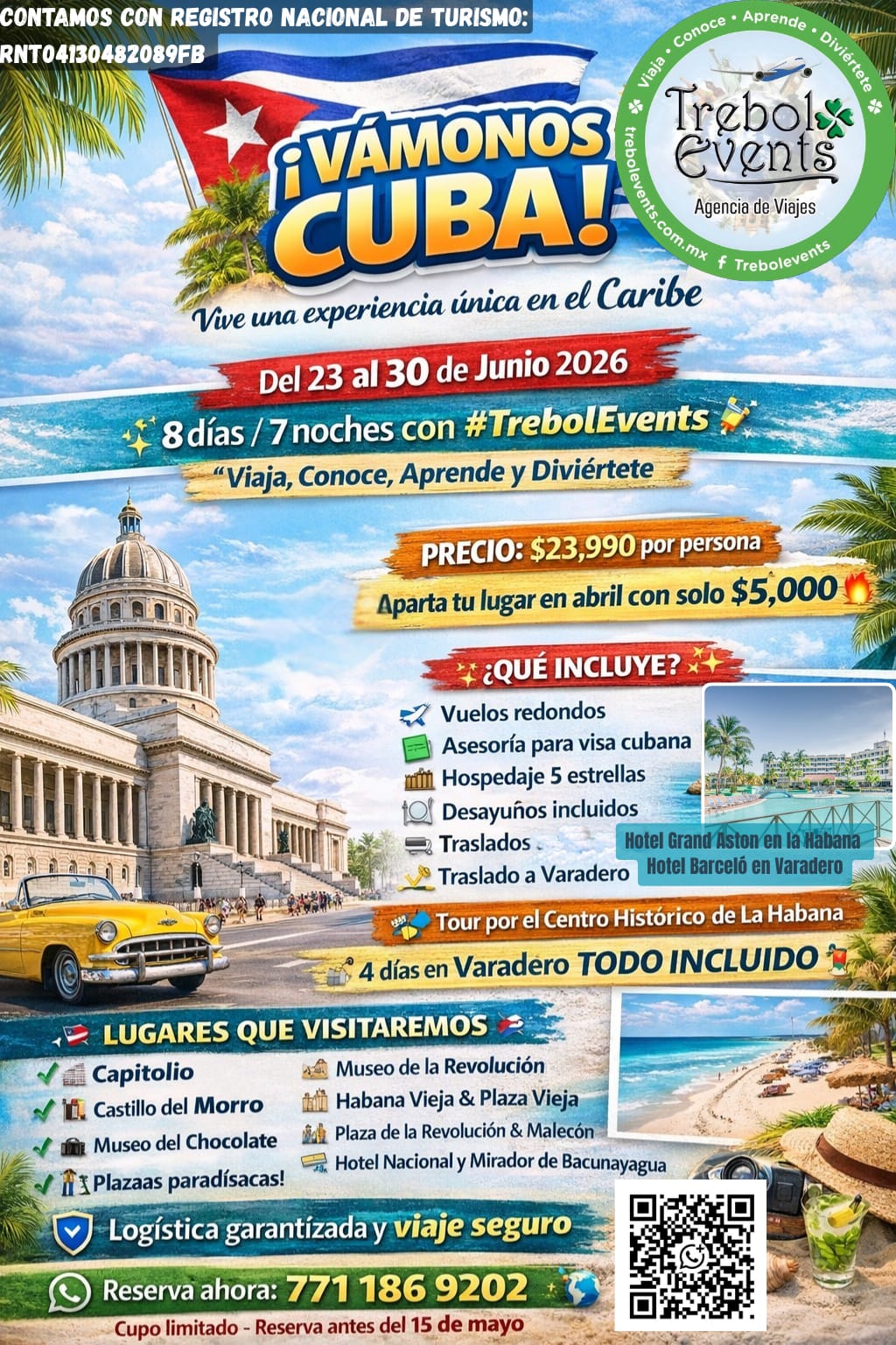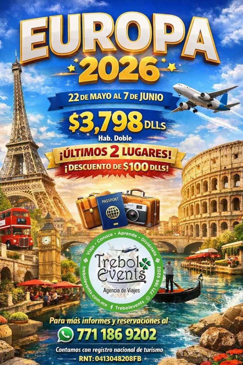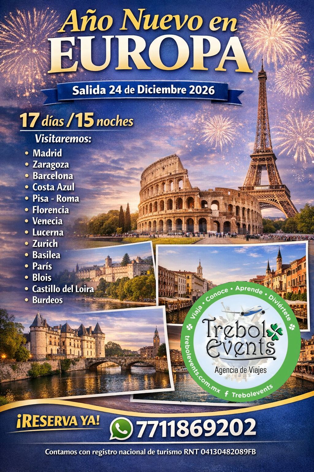 Somos una Empresa 100% mexicana fundada en la ciudad de Pachuca, Hidalgo bajo el nombre Trebol Events “Viaja, Conoce, Aprende y Diviértete”, teniendo un reconocido prestigio en el país y una amplia experiencia en el mercado turístico crea su marca trebolevents.com.mx para brindar a nuestros clientes la forma más fácil de reservar sus hoteles, tours, traslados y demás servicios para ofrecer a nuestros clientes una forma mas sencilla y segura de viajar al mejor precio en nuestras oficinas, online y por medio de WhatsApp 771 186 9202